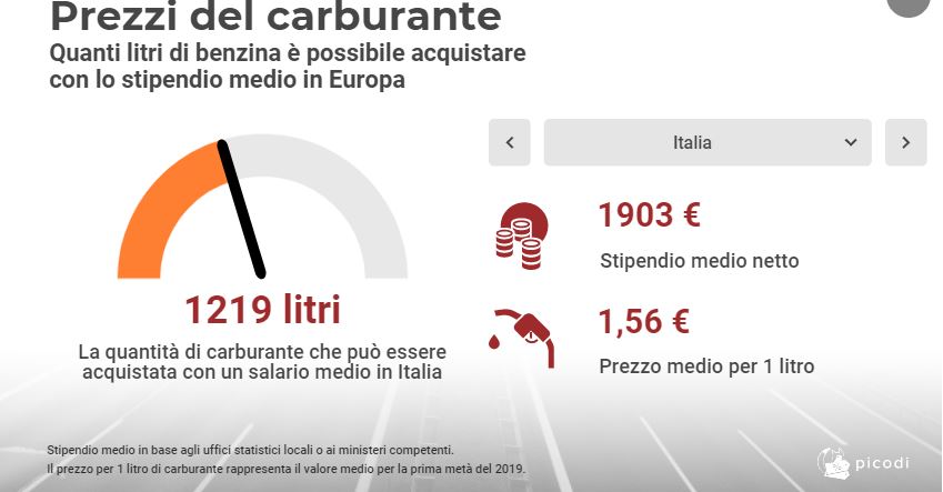 Il nostro Paese si piazza al 17° posto in base al salario medio, che ha un potenziale d’acquisto di 1.219 litri di carburante. Il nostro Paese si trova un punto più in basso nella classifica rispetto all’Olanda (16° posto e 1.279 litri) e un punto più in alto rispetto alla Spagna (18° posto con 1.126 litri), e Malta (19° posto con 931 litri). Nella parte inferiore della classifica sono presenti paesi come Moldavia, Ucraina e Albania, in cui la possibilità del salario medio non supera più di 300 litri di benzina, o un decimo di quello che può permettersi il leader della classifica europea.