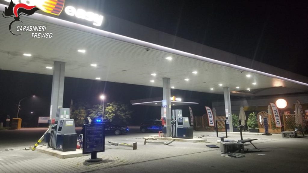 Con la ruspa abbattono le colonnine self service della stazione di servizio Q8 lungo la Postumia a Motta di Livenza. Protagonisti i malviventi di una banda che, nel cuore della notte, hanno preso di mira i dispositivi automatici per il pagamento del carburante, riuscendo a sradicarli dal supporto insieme alle barre di protezione.