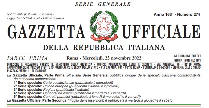 Nella Gazzetta Ufficiale del 23 novembre 2022 è stato pubblicato il Decreto Legge n. 179 del 23 novembre 2022, riguardante misure urgenti in materia di accise sui carburanti e di sostegno agli enti territoriali e ai territori delle Marche colpiti da eccezionali eventi meteorologici.