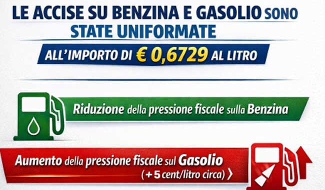 Dal 1° gennaio è infatti entrato in vigore il riallineamento delle accise su benzina e gasolio previsto dalla manovra di bilancio. La misura ha portato le due aliquote allo stesso livello, con una riduzione dell’accisa sulla benzina di 4,05 centesimi al litro e un corrispondente aumento sull’accisa del gasolio. Considerando anche l’effetto dell’IVA, l’impatto finale sui prezzi alla pompa è stimato in circa 5 centesimi al litro, con il gasolio che si attesta intorno a 1,784 euro al litro.