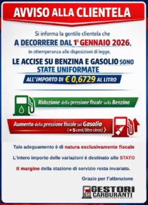 A tal proposito, abbiamo predisposto il presente cartello come comunicazione chiara e trasparente alla clientela, al fine di spiegare che l’adeguamento dei prezzi è dovuto esclusivamente a una variazione fiscale e non comporta alcun aumento del margine della stazione di servizio.