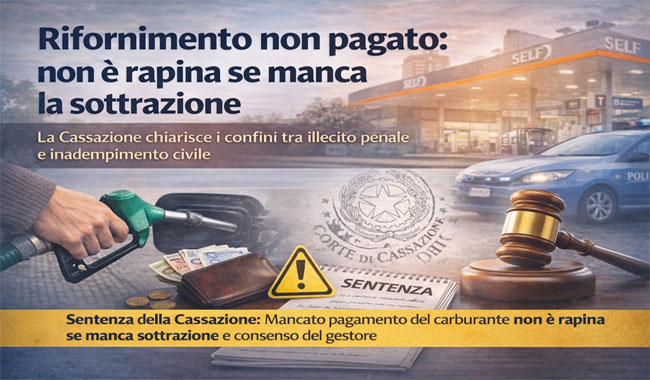 Con la sentenza n. 47925 del 18 ottobre 2023, la Corte di Cassazione – Sezione Penale II ha fissato un principio di particolare rilievo per il settore della distribuzione carburanti, chiarendo quando il mancato pagamento di un rifornimento non può essere qualificato come rapina impropria.